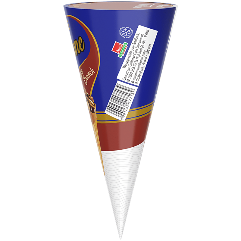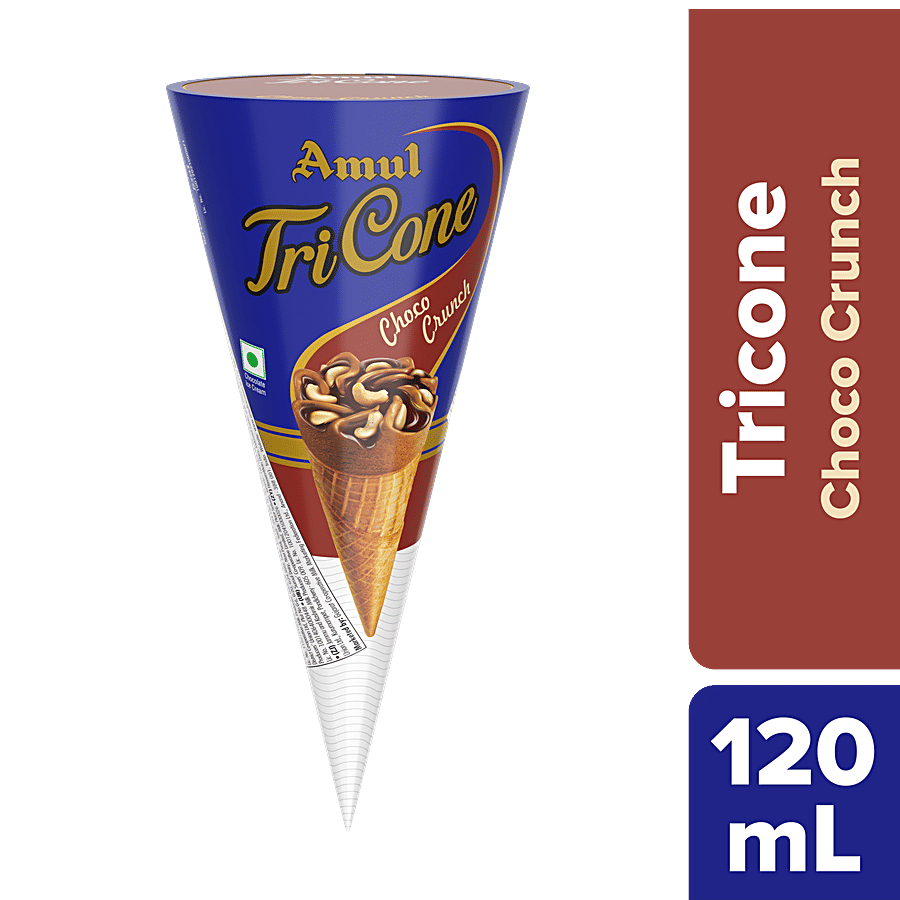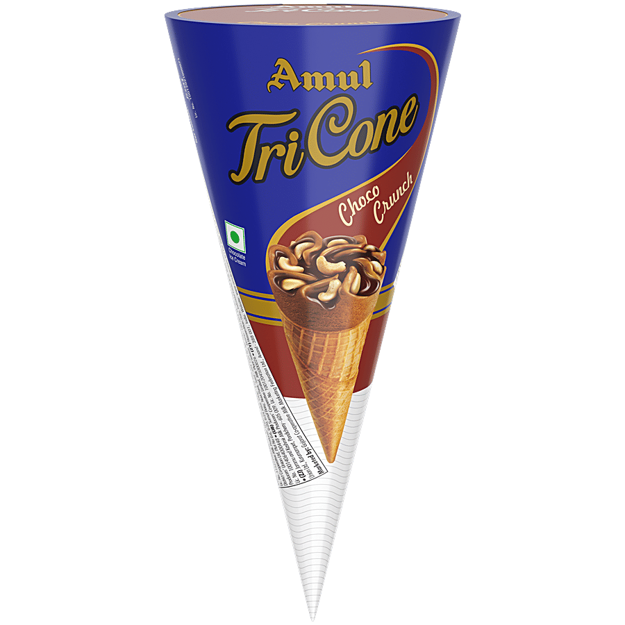 Indulge in a delightful dessert experience with Amul's Tricone Chocolate ice cream. Crafted with the finest natural ingredients, this delectable treat features a crispy wafer biscuit cone filled with rich, creamy chocolate ice cream. Topped with crunchy cashew nuts and a decadent chocolate sauce, it's a perfect blend of flavour and texture that will simply melt in your mouth. Amul's commitment to quality and health ensures a smooth, satisfying aftertaste, making this the ultimate indulgence for your taste buds. Enjoy the perfect harmony of chocolate and crunch in every bite of this heavenly dessert.
