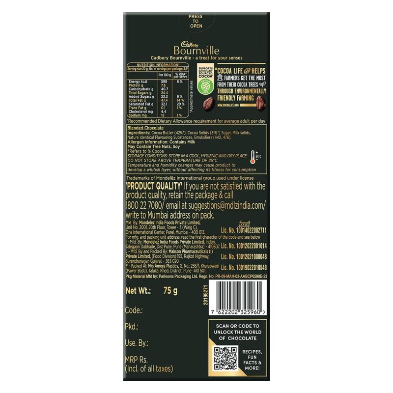 Cadbury Bournville Intense Rich Cocoa 70% Chocolate Bar, 75 Gm