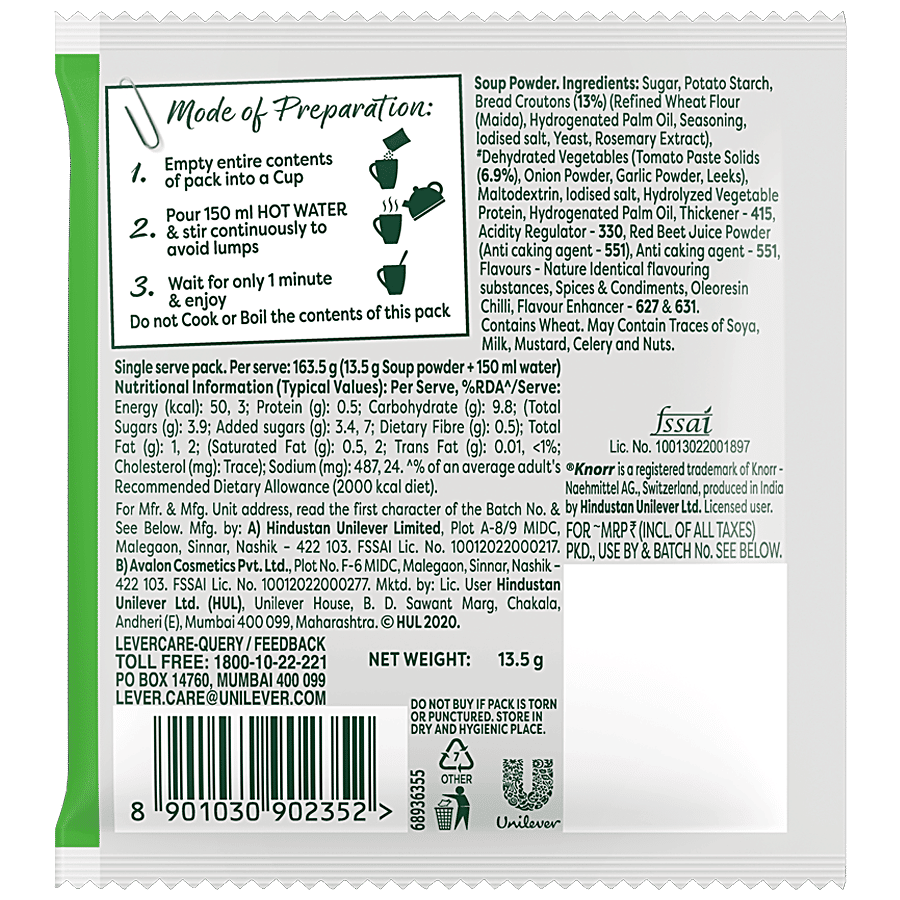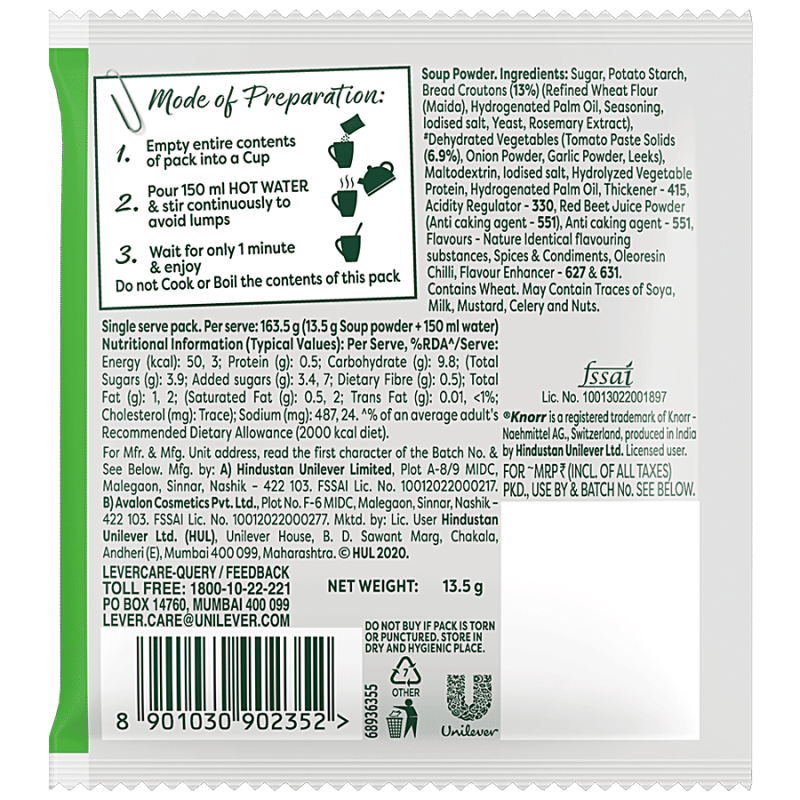 Elevate your snacking experience with Knorr Tomato Chatpata Cup-A-Soup, a tantalising blend of tangy tomatoes and aromatic spices, perfectly packaged in a convenient cup format. Enjoy the authentic taste of homemade soup in just minutes, whether you're craving a warm and comforting snack on a chilly day or need a quick pick-me-up between meals. Made with real vegetables and no added preservatives, this cup-a-soup satisfies your small hunger pangs in just 1 minute, delivering a crunchy, delicious, and easy-to-make experience every time. Indulge in this restaurant-like, flavourful soup at home, with the perfect combination of sour, sweet, salty, and spicy notes that will make this an instant hit.