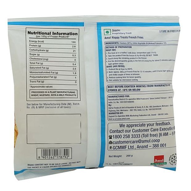 Amul Happy Treats presents an exciting range of frozen potato snacks, which are thick and crisp on the outside and soft on the inside. These French Fries served hot with tomato ketchup is an ideal anytime snack that can go well with lunch and dinner too. French fries are a favourite of most kids, making it an ideal play date or a birthday party snack. Amul French fries are A Grade thicker fries of 9 mm.