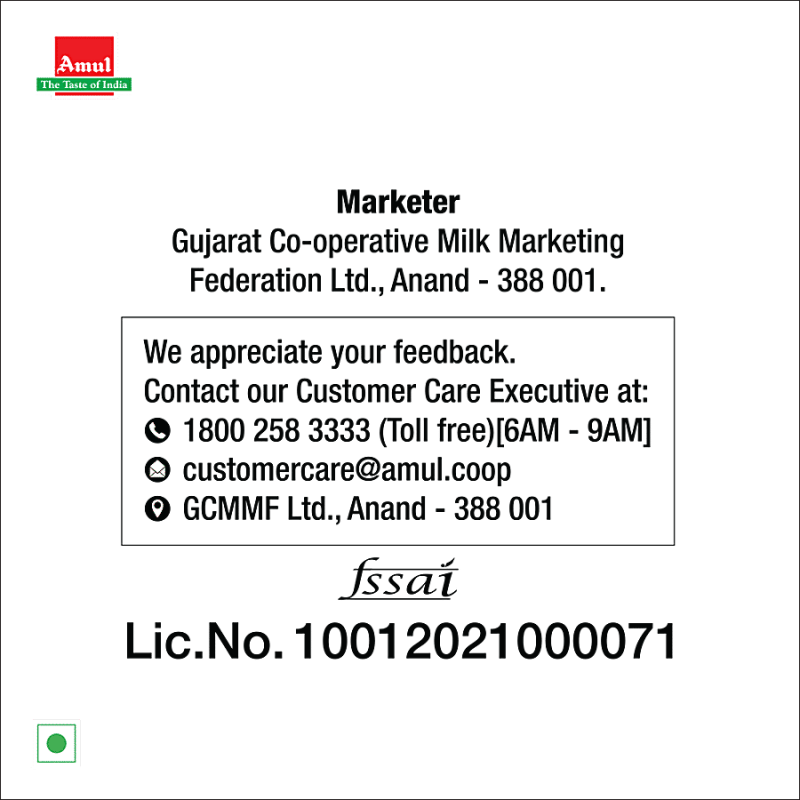 Manufactured & Marketed by: Kaira District Co-operative Milk Producers' Union Limited, Anand 388 001. At Food Complex Mogar, Mogar. Lic. No. - 10014021001010.