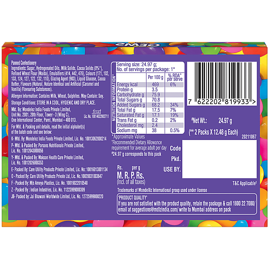 Indulge in the delightful Cadbury Gems, a true chocolate lover's delight! These colourful coated milk chocolate buttons are a beloved treat for both kids and adults alike. Bursting with a chocolatey flavour, these confectionery gems can be added to a variety of desserts, from puddings and cakes to biscuits and homemade chocolates, adding a fun and vibrant touch. Enjoy them straight from the pack for a delectable chocolate experience, or gift them to your loved ones on special occasions like birthdays and get-togethers. Suitable for vegetarians, Cadbury Gems are the perfect choice for a chocolatey indulgence