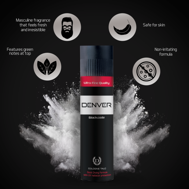 Get refreshed all day with Denver Black Code Talc. This refreshing talcum powder features a blend of fresh green notes and a woody accord for a masculine fragrance. Its smooth texture easily glides on the skin, helps to control moisture, oil, and odor, and leaves your skin feeling soft and fragrant all day long. Denver talcum powder is easy to spread and safe for daily use.